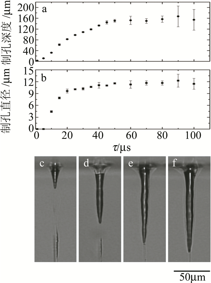針對激光打孔過程中玻璃崩邊及裂紋現象嚴重,高深徑比微孔加工難度大的瓶頸問題,許多學者提出了改進的打孔方法。為了減少微孔加工時裂紋的產生,KONO等人將二氧化鈰粉末和水的混合物涂覆到玻璃材料的表面后,晾干制成30μm的吸收層,之后再用波長為355nm的納秒激光器進行微孔加工,成功在硼硅玻璃和石英玻璃上分別加工出深徑比12以上的微孔,通過對照試驗還發現該方法可以大大減少裂紋的產生,并在不影響加工質量的前提下提高加工速度(XY工作臺進給速率高達100μm/s)。針對飛秒激光打孔制孔速度低、制孔時易產生損傷的問題,ITO等人[19]將波長為780nm的飛秒激光器與波長為1070nm的光纖激光器相結合,如圖 8a所示,加工時首先使用飛秒激光在玻璃基板上加工出高寬深比的細線,之后將光纖激光輻照到細線上逐步獲得所需的微孔(其中在飛秒激光輻照后的光纖激光輻照時間定義為時間延遲τ,如圖 8b所示), 研究發現, 飛秒激光產生的細線會選擇性地吸收光纖激光脈沖利用熱效應去除材料,可以有效地避免直接飛秒激光加工過程產生的強應力波對材料的損傷,制孔的直徑和深度與τ有關,如圖 9所示。試驗結果表明,該方法在40μs內加工出了直徑為10μm、深度達133μm的微孔,制孔速度只采用飛秒激光加工的5000倍以上, 且能有效地抑制裂紋的產生。為了解決傳統打孔由上至下的加工方式制孔時出現的坡度效應(制孔開口表現出入口大出口小的特征),WANG等人[20]提出在加工透明材料時,嘗試采用由下至上的打孔方式代替常規的由上至下方式,將激光透過材料聚焦于材料的下表面,由底部開始一層層地將材料向上去除, 試驗中分別采用波長為532nm的納秒激光、波長為1064nm的皮秒激光及波長為515nm的飛秒激光在康寧大猩猩玻璃上加工孔徑為100μm~120μm、深度為200μm~900μm的微孔, 試驗結果表明,在采用由下至上的加工方式時,脈寬區間不存在死亡谷(自納秒開始,脈寬愈短,材料移除率愈低,在2ns~50ps之間移除率非常低),脈寬為2ns~50ps的激光切割效率高于超快激光,能夠實現零錐度鉆孔且玻璃的崩邊尺寸小于50μm。